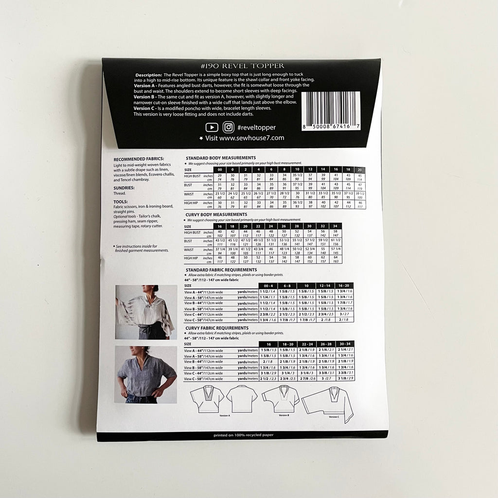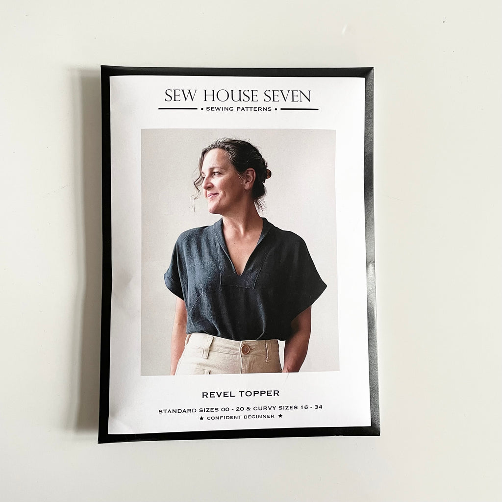 The Revel Topper is a simple boxy top that is just long enough to tuck into a high to mid-rise bottom. Its unique feature is the shawl collar and front yoke facing.
