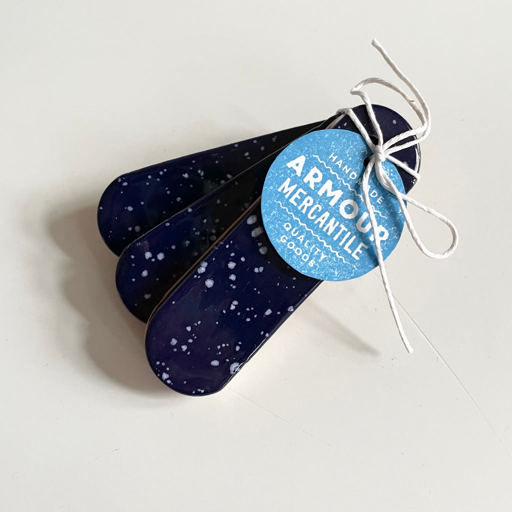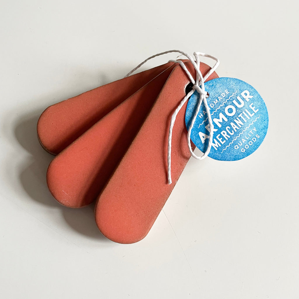 A set of 3 ceramic pattern weights to keep narrow pattern pieces (you know… your collar stands, facings, plackets, etc.) in place while outlining your sewing projects. Pair these with a standard set or two and you’re in business!