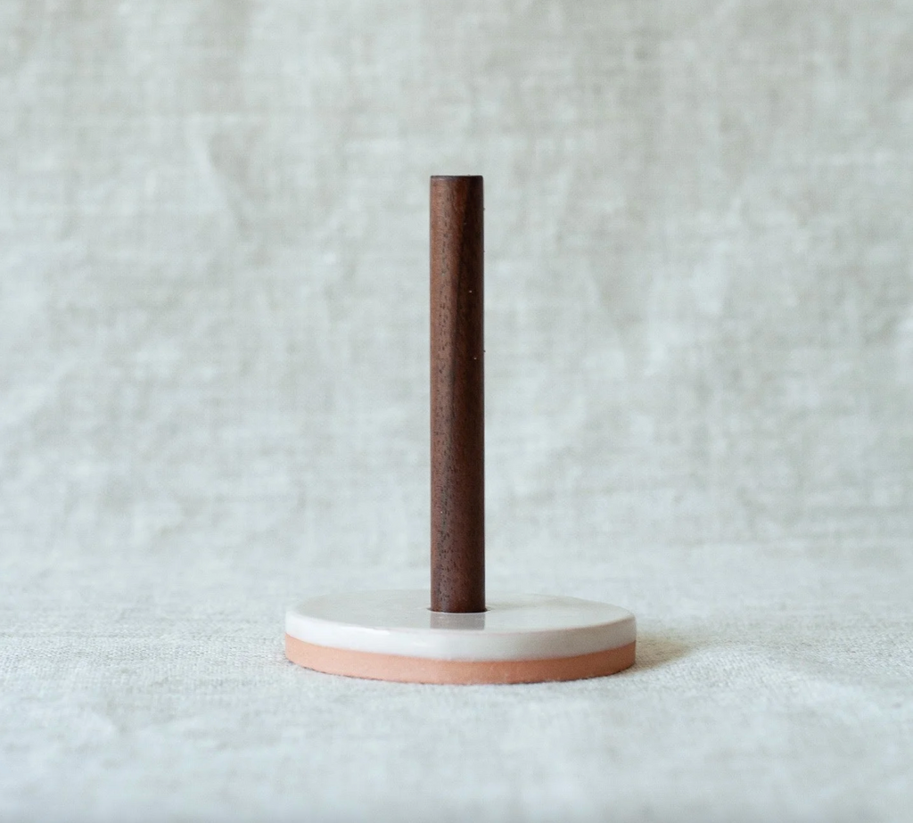 A simple, functional stand for organizing up to 8 pattern weights. The ceramic base can serve as an additional weight during cutting or layout. Finished with a solid walnut rod.