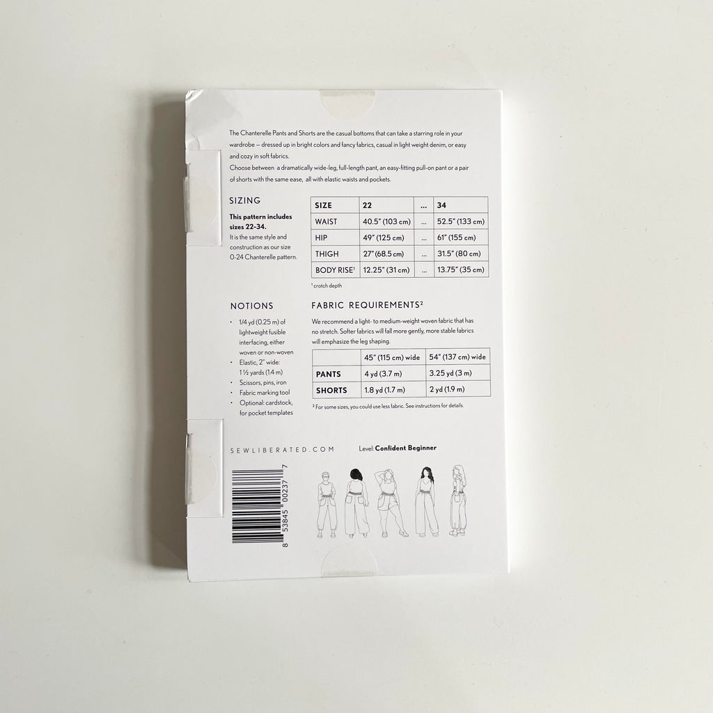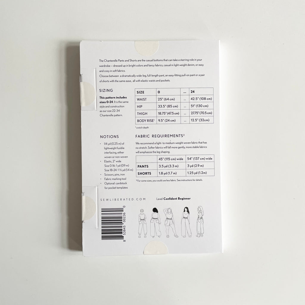 Bring a little ease and a whole lot of fun to your wardrobe with the Chanterelle Pants and Shorts pattern. Featuring a comfortable and easy-to-fit elastic waist, wide leg, barrel leg, and shorts views, Chanterelle will fill any gap in your wardrobe and be an all-seasons piece for years to come. View A is a dramatically wide-leg, full-length pant with an elastic waist, inset front pockets, and back patch pockets. View A has more design ease than Views B and C. View B is an easy-fitting pull-on pant with an elastic waist, patch pockets on the front and back, and a playful cropped leg silhouette shaped with a pleat and a cuff at the ankle. View C is a pair of shorts with the same ease, waistband, and patch pockets as View B, and a 3" – 4" (7.5 – 10cm) inseam. Includes sizes 0-24.