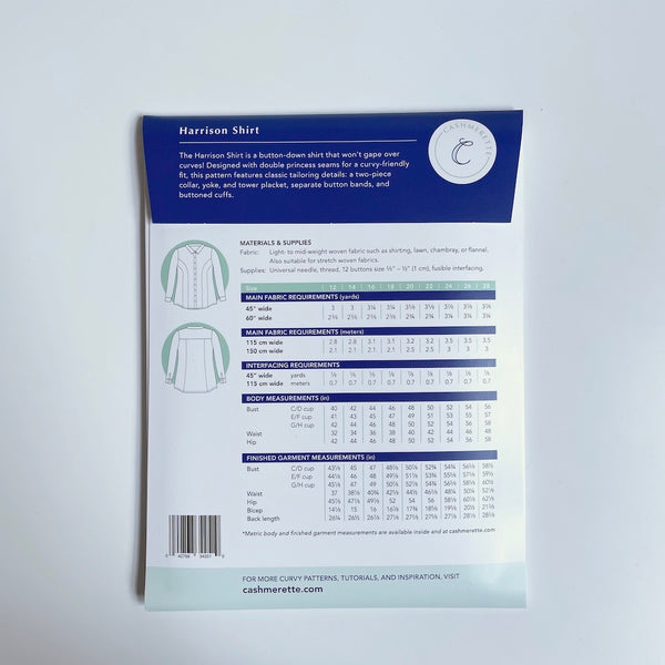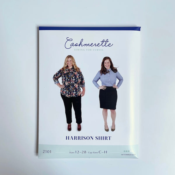 The Harrison Shirt is a button-down shirt that won't gape over curves! Designed with double princess seams for a curvy-friendly fit, this pattern features classic tailoring details: a two-piece collar, yoke, sleeve placket, separate button bands, and buttoned cuffs.