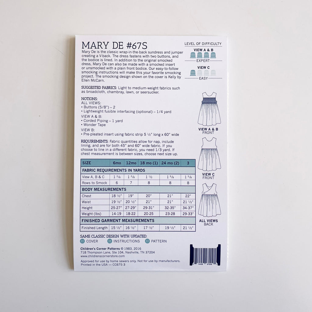 Mary De is the classic wrap-in-the-back sundress and jumper creating a V-back. The dress fastens with two buttons and the bodice is lined. In addition to the original smocked dress, Mary De can also be made with a smocked insert or unsmocked with a plain front bodice. Our easy-to-follow smocking instructions will make this your favorite smocking project.