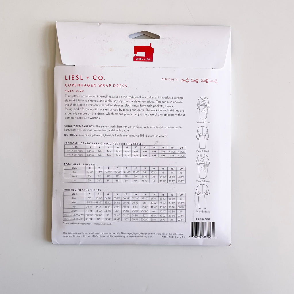 This pattern provides an interesting twist on. the traditional wrap dress. It includes a sarong-style skirt, billowy sleeves, and a blousy top that's a statement piece. You can also choose the short-sleeved version with cuffed sleeves. Both views have side pockets, a neck facing, and a forgiving fit that's enhanced by pleats and darts. The neckline and skirt ties are especially secure on this dress, which means you can enjoy the ease of a wrap dress without common exposure worries.