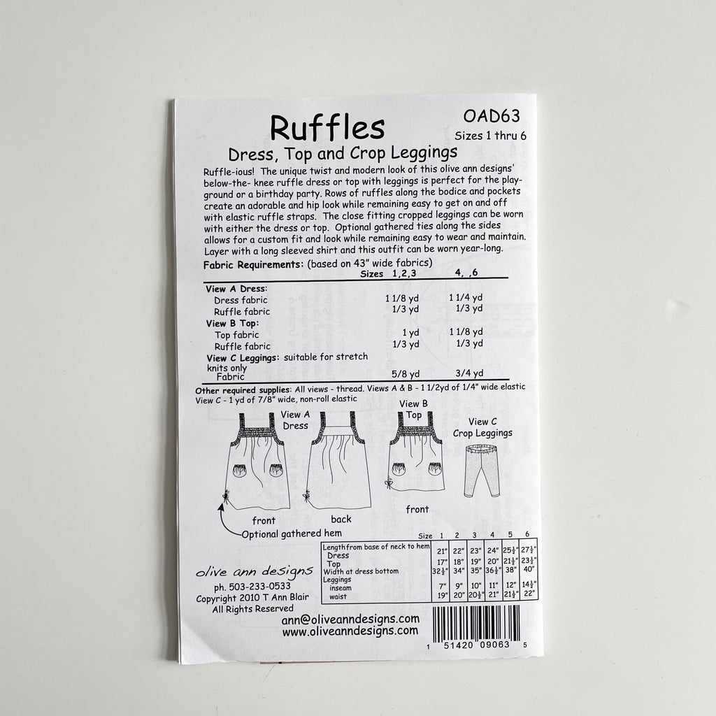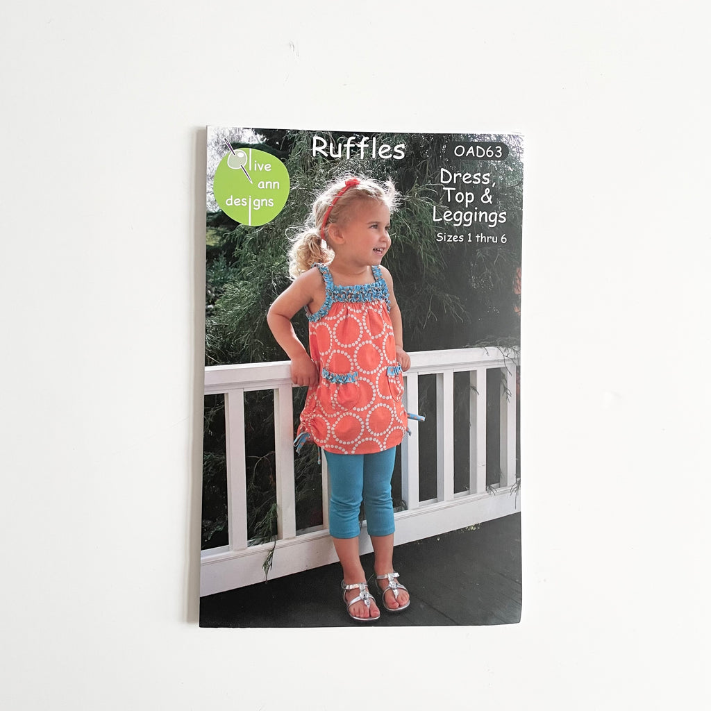 Ruffle-ious! The unique twist and modern look of this olive ann designs' below-the- knee ruffle dress or top with leggings is perfect for the play-ground or a birthday party. Rows of ruffles along the bodice and pockets create an adorable and hip look while remaining easy to get on and off with elastic ruffle straps. The close fitting cropped leggings can be worn with either the dress or top. Optional gathered ties along the sides allows for a custom fit and look while remaining easy to wear and maintain. Layer with a long sleeved shirt and this outfit can be worn year-long.