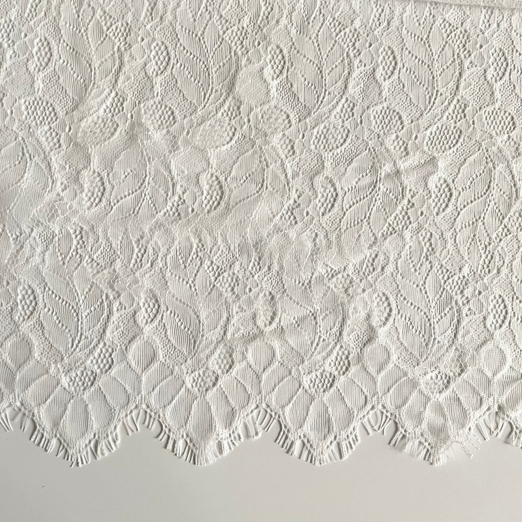 Lightweight double-scalloped nylon lace, perfect for pretty bridal wear, sweet dresses and blouses, lingerie, and curtains.