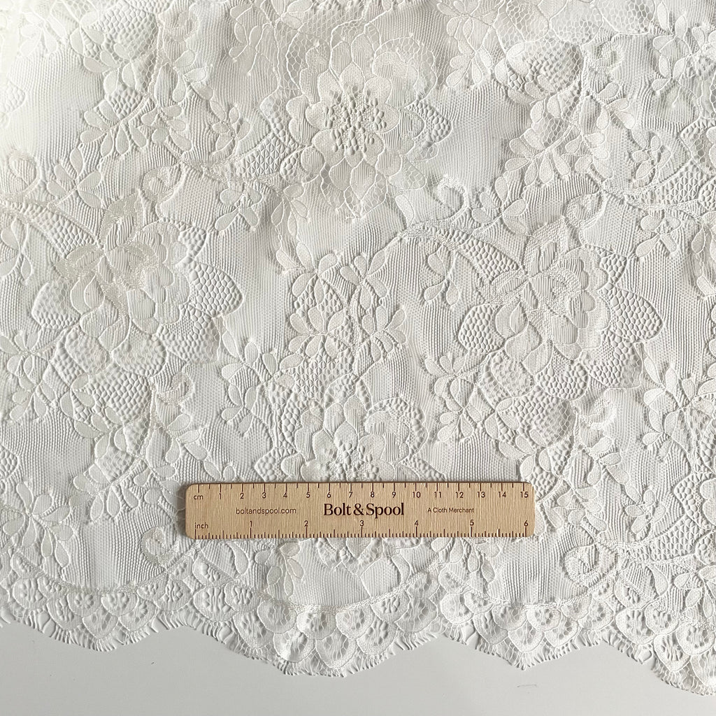 Lightweight double-scalloped nylon lace, perfect for pretty bridal wear, sweet dresses and blouses, lingerie, and curtains.