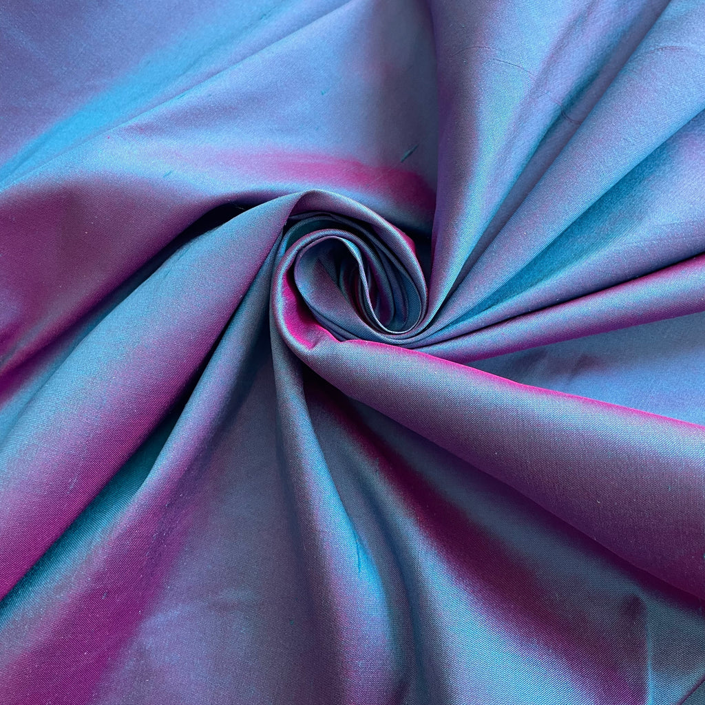 A fanciful iridescent material, woven with blue and purple threads, creating color-shifting effect depending on how the light hits it. Silk dupioni is woven with slubs to produce a bumpy texture with a brilliant sheen that flits from blue to purple. It is wrinkle resistant, crisp, and would be elegant in more fitted garments, such as structured dresses and skirts or tailored jackets and pants. It would also make a luxurious pillow.