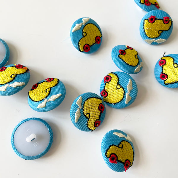 Fabric-covered plastic shank button with a bright yellow car ambling across.