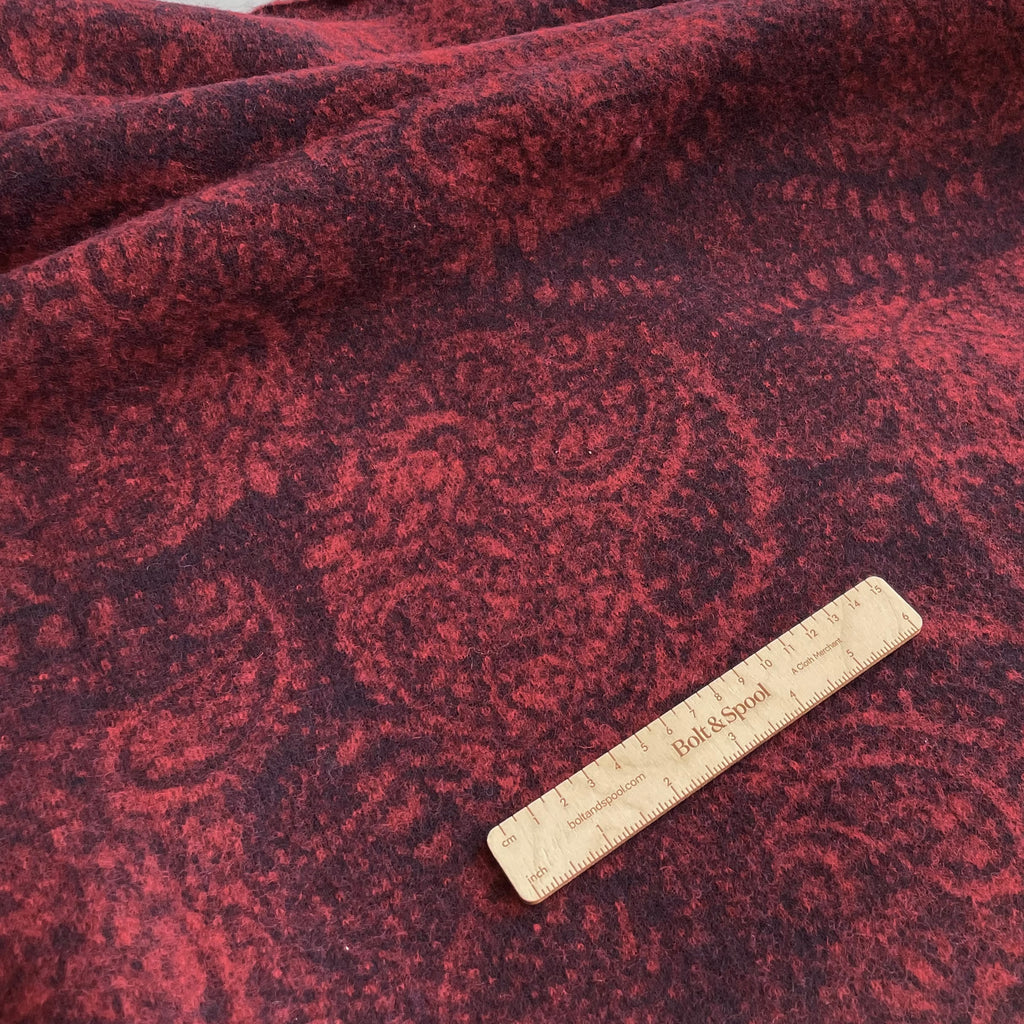 Plush, warm knitted wool and cotton blend in a red and blue paisley pattern, felted like a sweater from the thrift store that was accidentally thrown in the wash. Incidentally, this would make a great sweater! Or a warm blanket, coat or jacket.