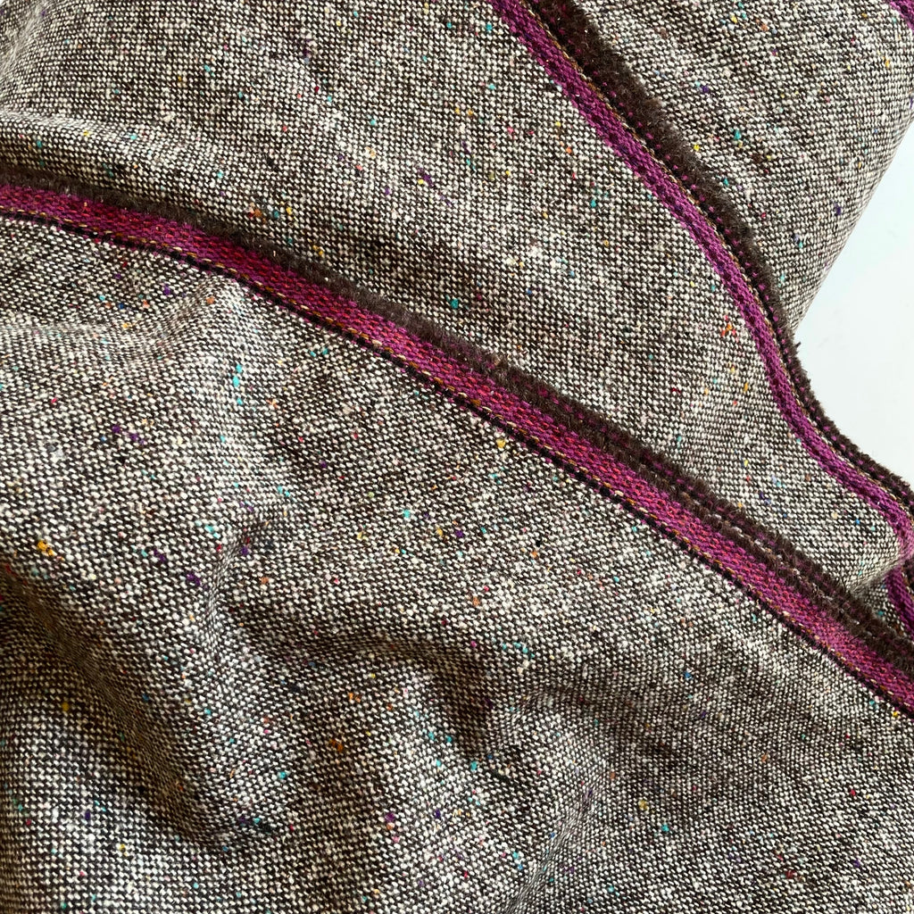 Medium weight heathered brown wool with colorful flecks woven throughout. Ideal for coats and jackets, blazers, hats, and lined pants.
