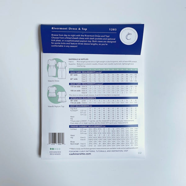 Breeze from day to night with the Rivermont Dress and Top! Choose from a fitted sheath dress with slash pockets and optional kick pleat, or a sophisticated peplum top. Both views are designed for ponte knits and feature three sleeve lengths, so you're comfortable in any season!