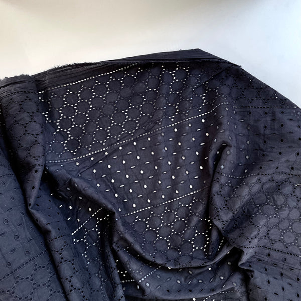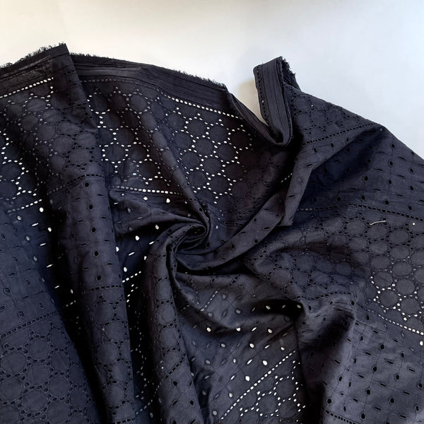 A navy broderie anglaise with a repeating design every 14cm. Broderie anglaise is a whitework needlework technique incorporating features of embroidery, cutwork and needle lace.