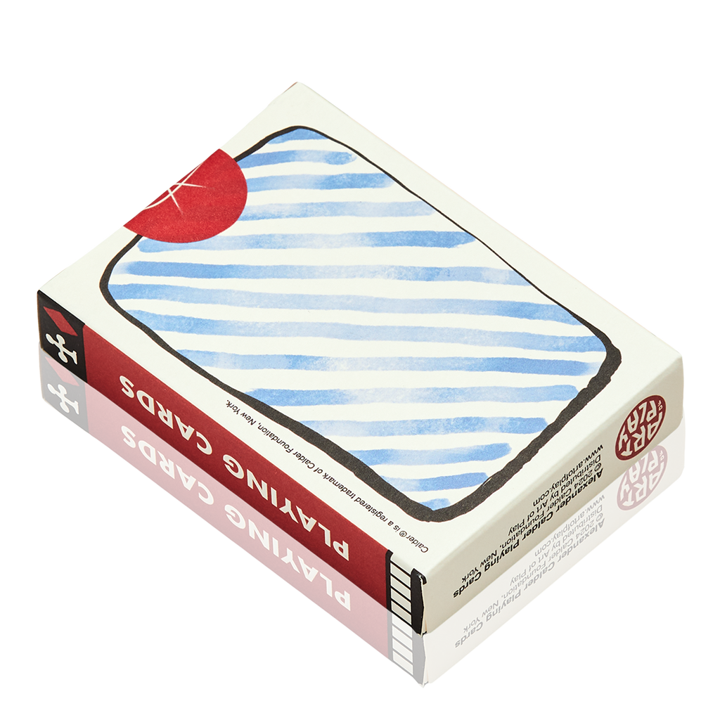 Calder Playing Cards are based on a set of vivid gouache paintings from the 1970s known as the Card Player series. Many of the cards are direct reproductions from those paintings, with the striped back also pulled from them. All letters and numbers are in Calder’s own handwriting. Since court cards were not included in the original images, the faces for the Jack, King, and Queen were extracted from another series of gouaches that Calder painted around the same period. Every detail of this deck was faithfully reproduced to celebrate the enduring legacy of Calder, the iconic master of innovation in art.