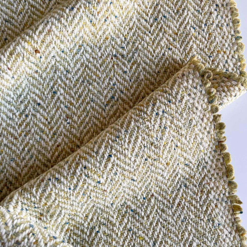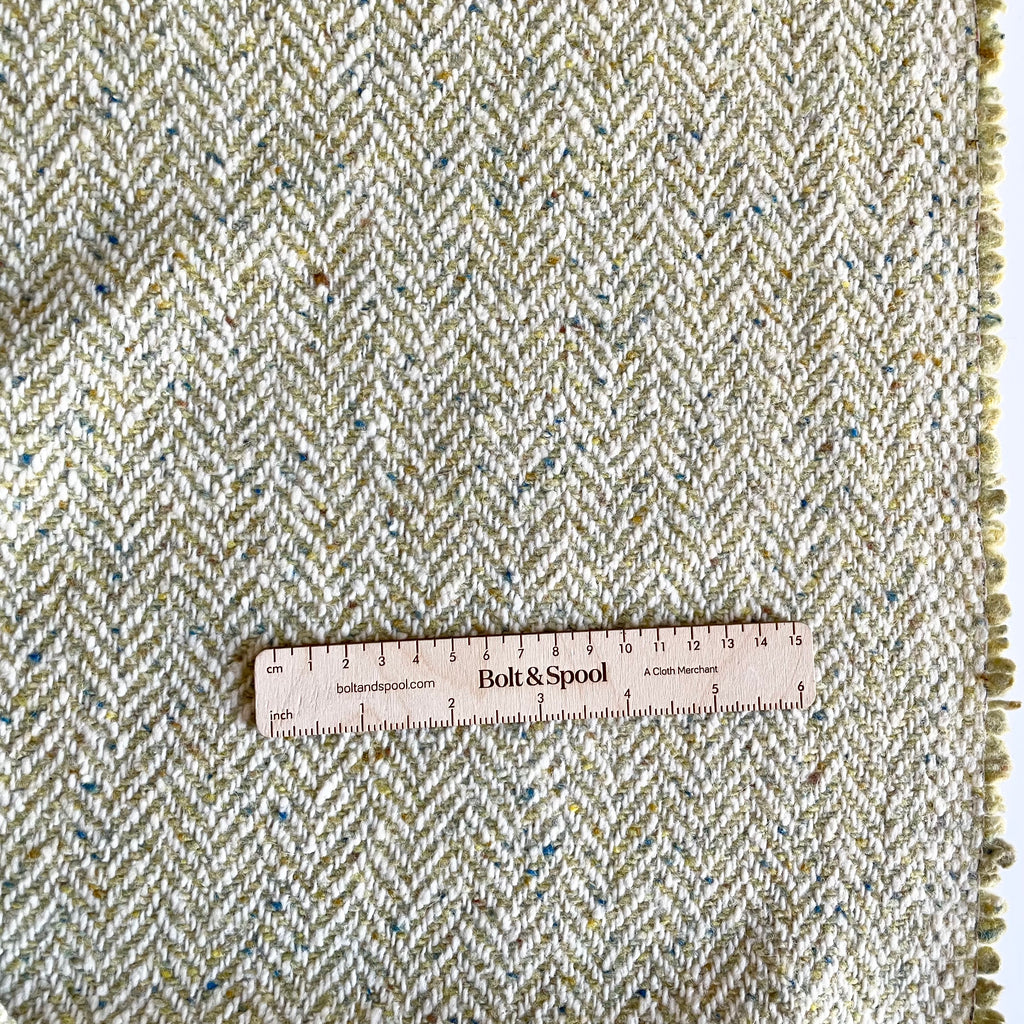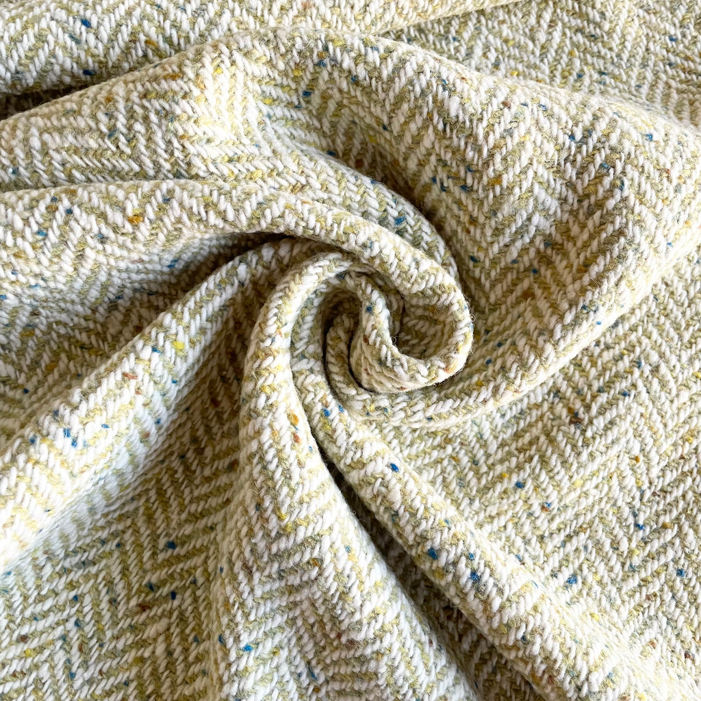 Heavy-weight wool coating with a herringbone weave and bright flecks of color. Ideal for warm coats and pants, and cozy bags and home decor.