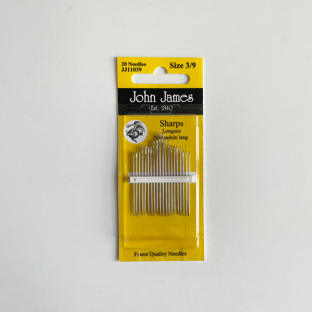 Variety pack of 20 metal hand-sewing needles, in an assortment of sizes from size 3 to size 9.