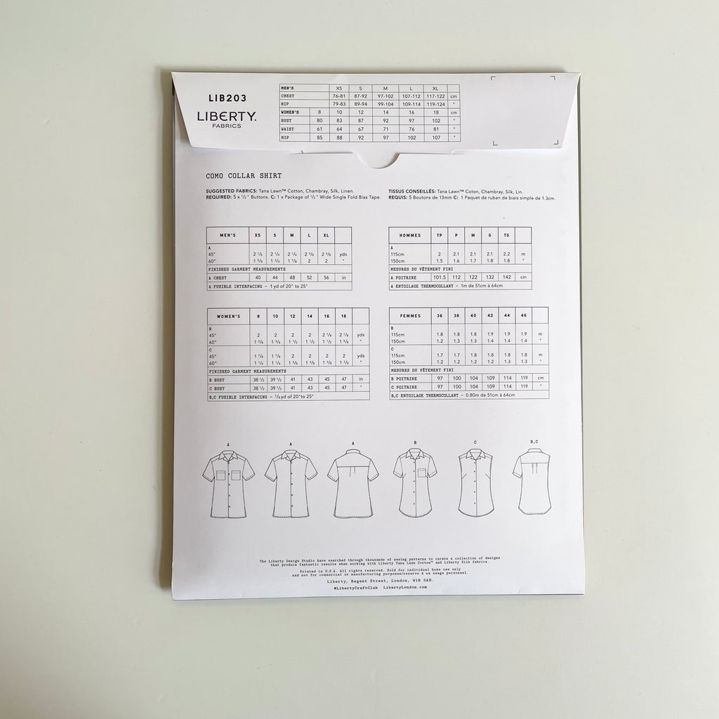 Liberty Fabrics Sewing Pattern : Como Collar Shirt