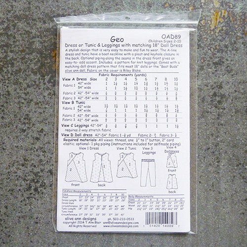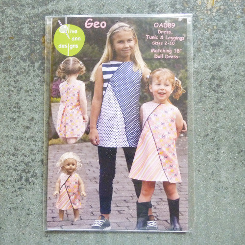 Make a dress or tunic and leggings with a matching 18" doll dress. The Geo is a stylish design that is very easy to make and fun to wear. The A-line dress and tunic have a boat neckline with a pleat and keyhole closure in the back. Optional piping along the seams in the dress front gives and easy-to-add accent. Includes a pattern for knit leggings. Comes with a matching doll dress pattern that fits most 18" dolls or the "Best Buds" Olive Ann doll. For child sizes 2 - 10.
