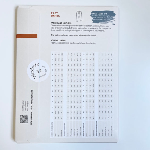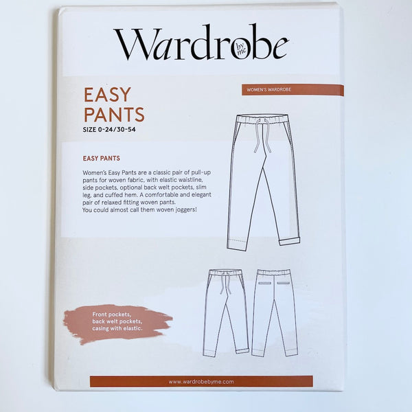 The Easy pants sewing pattern is a classic pair of pull-up pants for woven fabric, with elastic waistline, side pockets, optional back welt pockets, slim leg, and cuffed hem. A comfortable and elegant pair of relaxed fitting woven pants. You could almost call them woven joggers!